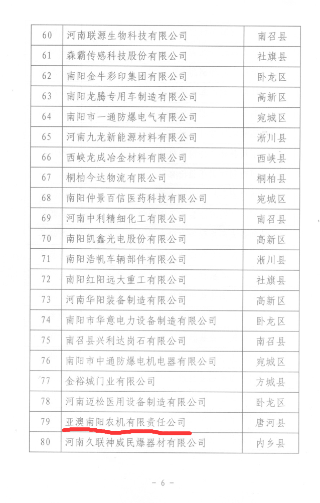 為深入實(shí)施創(chuàng)新驅(qū)動(dòng)發(fā)展和“兩輪兩翼”發(fā)展戰(zhàn)略,增強(qiáng)全市企業(yè)自主創(chuàng)新能力和核心競爭力,引領(lǐng)促進(jìn)企業(yè)成為技術(shù)創(chuàng)新主體,按照《南陽市科技創(chuàng)新百強(qiáng)企業(yè)考核評定辦法》要求,亞澳農(nóng)機(jī)等6家企業(yè)榮獲此榮譽(yù)。