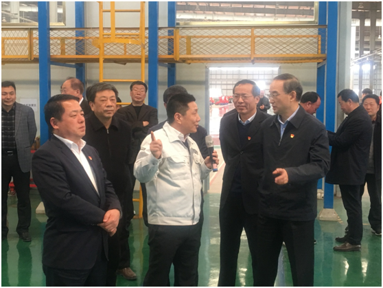 在唐河縣的亞澳南陽農(nóng)機有限公司,黃省長一行實地察看了企業(yè)生產(chǎn)現(xiàn)場,了解企業(yè)生產(chǎn)經(jīng)營、產(chǎn)品保護(hù)性耕作,防止耕作過程中的秸稈焚燒和揚塵、技術(shù)創(chuàng)新等情況。對該公司的智能激光切割、自動化機器人焊接及PLC粉體涂裝生產(chǎn)線,環(huán)保除塵系統(tǒng)詳細(xì)查看,邊聽邊問,尤其對亞澳農(nóng)機發(fā)展綠色清潔生產(chǎn)建設(shè)的粉體涂裝產(chǎn)線,和屋頂光伏電站、雨水收集循環(huán)利用大手筆投入尤為贊嘆。聽史炳哲總經(jīng)理匯報亞澳農(nóng)機涂裝設(shè)備是目前先進(jìn)的環(huán)形磁芯的粉體涂裝線,其采用PLC人機界面控制系統(tǒng),使各工序自動化運行,所有工序一次性完成,比傳統(tǒng)振動雙面烘烤涂裝的品質(zhì)更加優(yōu)良,更節(jié)省涂料,還可實現(xiàn)廢料回收再利用,并實現(xiàn)了全自動生產(chǎn)涂裝,高效節(jié)能。