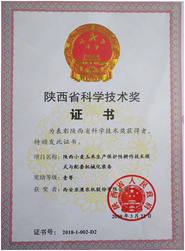 日前,全省科技創(chuàng)新大會暨科學技術獎勵大會在西安隆重召開,省委書記胡和平出席會議并講話,省長劉國中主持會議,會議表彰了2018年度省科學技術獎獲獎項目,并向最高成就獎及一等獎獲獎者頒發(fā)了獎勵證書。亞澳農機和西北農林科技大學合作研發(fā)的“陜西小麥玉米生產保護性耕作技術模式與配套機械化裝備”項目成果榮獲省科技進步一等獎。