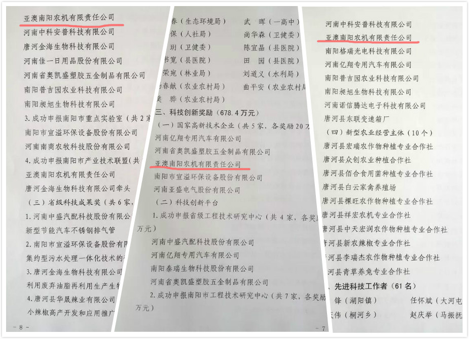 亞澳農(nóng)機共獲得政府獎勵35萬元。包括成功申報國家高新技術(shù)企業(yè)20萬元獎勵、市級工程技術(shù)研究中心5萬元獎勵、南陽市產(chǎn)業(yè)技術(shù)聯(lián)盟10萬元獎勵10萬元。