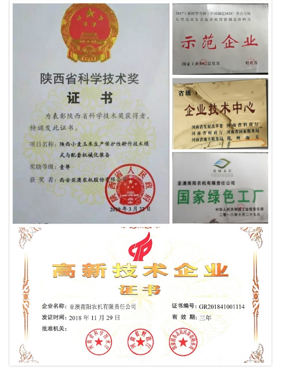 亞澳農(nóng)機(jī)堅(jiān)持“產(chǎn)品就是人品、內(nèi)在是我心、外在是我臉”的品質(zhì)原則,多功能變速旋耕機(jī)、旋播施肥機(jī)、聯(lián)合耕整機(jī)、雙軸滅茬機(jī)、精量免耕播種機(jī)、深松機(jī)等產(chǎn)品在耕整機(jī)械(主機(jī)配套40-300馬力)領(lǐng)域處于行業(yè)前列, 累計(jì)取得自主專(zhuān)利78項(xiàng)。2018年“亞澳”商標(biāo)獲得中國(guó)馳名商標(biāo),產(chǎn)品多次被中國(guó)農(nóng)機(jī)化協(xié)會(huì)、中國(guó)農(nóng)業(yè)機(jī)械流通協(xié)會(huì)、中國(guó)農(nóng)業(yè)機(jī)械工業(yè)協(xié)會(huì)授予“AAA級(jí)信用企業(yè)”、“技術(shù)進(jìn)步獎(jiǎng)”、“產(chǎn)品創(chuàng)新獎(jiǎng)”、“全國(guó)農(nóng)機(jī)用戶(hù)滿(mǎn)意品牌”、“最具影響力品牌”,被國(guó)家相關(guān)部委單位授予農(nóng)業(yè)部科技進(jìn)步三等獎(jiǎng)、星火計(jì)劃金獎(jiǎng)、西安市科技進(jìn)步一等獎(jiǎng)、陜西省行業(yè)之星企業(yè),“專(zhuān)精特新”中小企業(yè),南陽(yáng)市級(jí)科技百?gòu)?qiáng)企業(yè)等多項(xiàng)殊榮;國(guó)家型高新技術(shù)企業(yè),在農(nóng)機(jī)行業(yè)中具有較高的美譽(yù)和知名度,得到了社會(huì)的廣泛認(rèn)可。